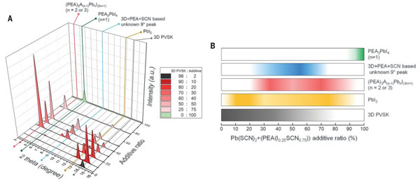 钙钛矿光伏(PV)技术已取得实质性进展,目前单结器件的创纪录效率达到> 25%。商业化这些器件最有希望的策略之一是将钙钛矿顶部电池与Si底部电池串联使用,以达到超出单结器件的Shockley-Queisser极限的超高效率。大多数研究钙钛矿/Si串联太阳能电池都采用钙钛矿吸收剂,其常规带隙为1.5至1.6 eV,但串联配置的理想带隙为顶部电池约为1.67至1.75 eV,底部电池约为1.12 eV。 尽管某些已报道的钙钛矿/Si串联装置使用了宽带隙钙钛矿(接近1.7 eV),但据报道功率转换效率(PCE)≤25%。钙钛矿的带隙可以通过用溴或氯(部分)替代碘阴离子来调节。但是,用大于约20%的Br代替I,这是将带隙扩大至〜1.7 eV所必需的,通过相分离形成富I和富Br结构,导致在光照下的稳定性问题。一种稳定钙钛矿的方法是创建二维(2D)相,其中[PbX6]-2八面体薄片被过量的用作钝化剂的长链(或芳族)分子隔开。常见的基于长链或芳香族分子的2D添加剂包括碘化正丁基铵(n-BAI)和碘化苯乙铵(PEAI)。由这些2D添加剂引起的钝化层的形成提高了效率,特别是开路电压(VOC)。然而,由于2D形成分子的电绝缘特性,其过量掺入通常会降低填充因子(FF)。因此,在前体溶液中添加2D分子的浓度已被限制为〜1mol%。