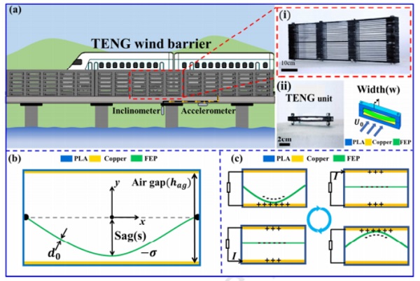 (a)TENG风屏障的应用场景,TENG单元的照片以及TENG单元的示意图