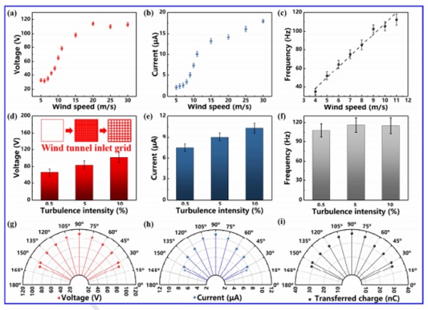图3. TENG单元的发电性能与风速,湍流度和风向的关系