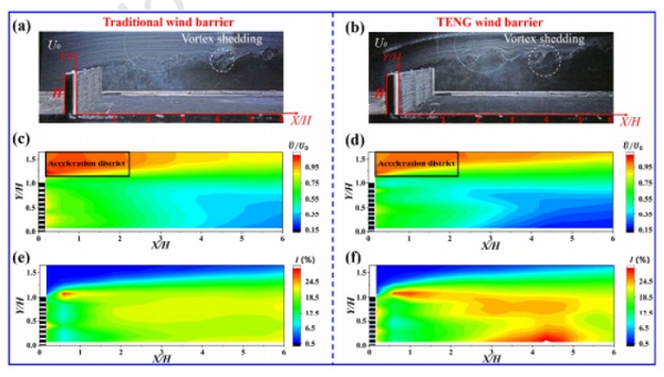 图5. TENG风屏障和传统风屏障的挡风性能对比
