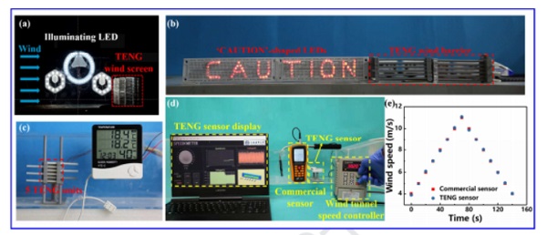 大连海事大学徐敏义教授团队和中南大学王汉封教授提出并系统地研究了由大量TENG单元构成的多功能TENG风屏障。TENG风屏障不但可以从自然风中收集能量,还可以收集过往车辆产生的滑流的能量。需要着重提及的是,高速运行车辆产生的滑流通常被认为对周围的人和建筑物是具有极大危害的。由于其方向随机和不稳定的特点,无法通过传统的风能收集方法进行收集。在这项工作中,TENG风屏障可以对滑流能量进行有效的收集。而且,研究人员还发现TENG风屏障挡风效率要比传统的多孔式风屏障高出35%,这一特性大大提高了运行车辆的安全性。另外,科研人员发现在TENG单元中FEP膜的颤动频率与风速成线性关系,利用这一特点可以将TENG单元用作风速计来监测风屏障的工况。综上所述,这项工作证明了TENG风屏障在挡风,能量收集和自供能风速传感方面展现出了明显的优势,并为TENG在其他领域的进一步应用提供了理论基础。