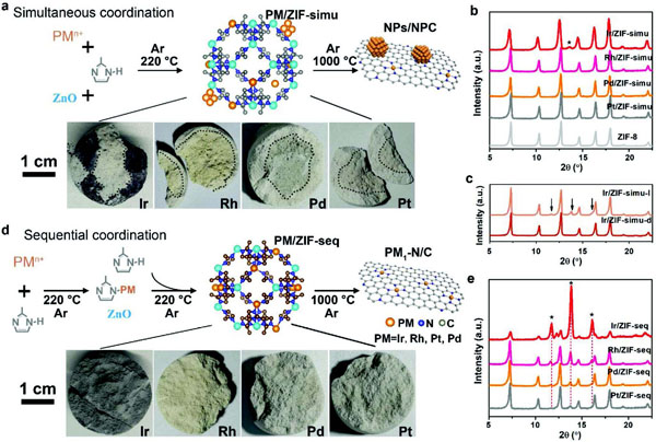 此外,高效SACs需要高金属负载量,沸石咪唑酯骨架(ZIF)-8是一种常用SACs载体前体。科学家们已经开发出了掺杂法(将Zn替换为外来金属离子)或封装法(利用微孔捕获外来金属离子)将非贵重过渡金属(Fe、Co、Ni等)和稀土金属(Y、Sc)加入到ZIF-8中,可在热解后将其转化为金属含量约2~3 wt%的碳载氮配位SACs。然而,传统的掺杂策略对PM不是很有效,这可能是因为与锌相比,PM的竞争力较弱或离子尺寸过大;而封装法只获得了很低的Ru、Pd载量(≤0.2 wt%),因此,合成ZIF基高PM负载SACs仍然是一个挑战。