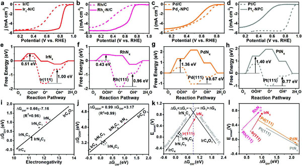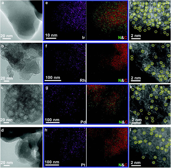 i-l)分别为Ir1-N/C、Rh1-N/C、Pd1-N/C和Pt1-N/C的HAADF-STEM图像。圈出的白色斑点是PM原子。