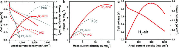 c)H2-air PEMFC中Ir1-N/C的极化曲线和功率密度图。H2/air 2 bar,80℃,100%RH,5 cm2单体电池。