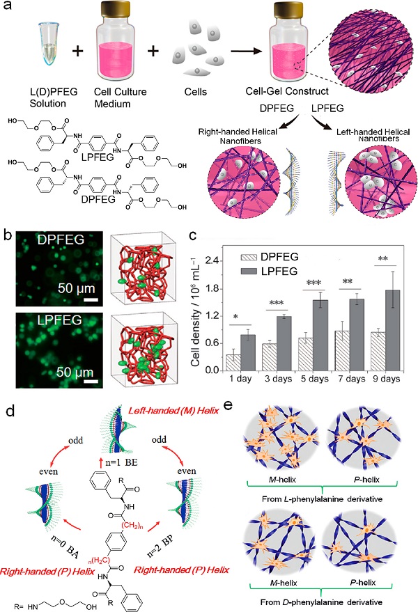 与分子手性相比,超分子手性的重要性及其潜在的生物功能尚未得到充分探讨。然而,由分子基元不对称空间排列而产生的超分子手性(例如DNA中的双螺旋结构)则在生物体内参与了许多重要生理过程。受这些高度复杂的超分子手性结构及其相应的生物学事件的启发,化学、材料科学和生物学的一个挑战和潜在的研究方向是构建具有手性结构可调的超分子组装体。由超分子组装体构建的水凝胶因其理化性能与天然ECM十分类似,是一类很有潜力的生物材料。特别是,与传统聚合物水凝胶不同,超分子水凝胶中分子基元通过非共价键(如氢键、π-π堆积、范德华力或疏水作用)相互作用,由于非共价的形成具有可逆性,因此超分子水凝胶对外场刺激(如温度、溶剂、pH、酶和光)和生化信号有很好的刺激响应,并能为细胞生长提供一个动态的环境。基于此,由手性组装体构筑的超分子水凝为模拟生物系统的结构和功能提供了一个良好选择,这对于理解超分子手性在生物学中的重要作用具有十分重要的意义。