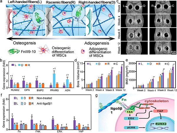 (a)纳米纤维手性结构诱导干细胞分化的原理图;