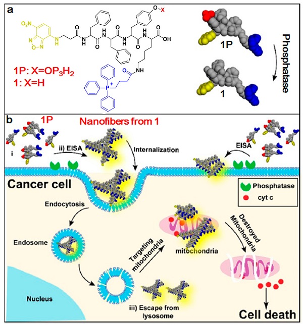(b)酶诱导构建的纳米纤维靶向作用于线粒体并触发癌细胞凋亡的原理图。