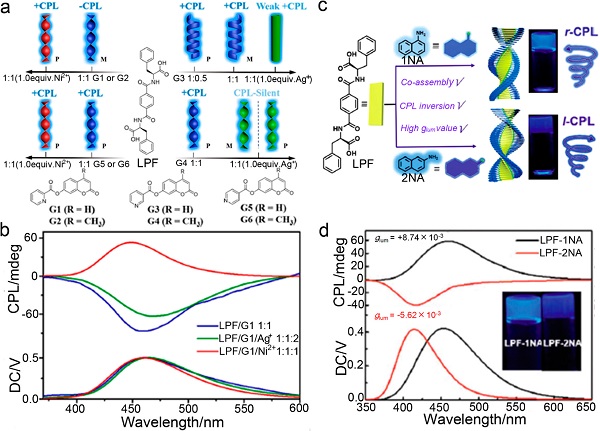(a)基于LPF和香豆素衍生物(G)共组装的具有CPL特性的手性结构,可通过改变香豆素衍生物或将金属离子加入共组装来调节CPL;