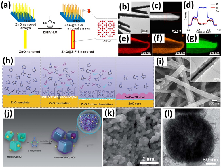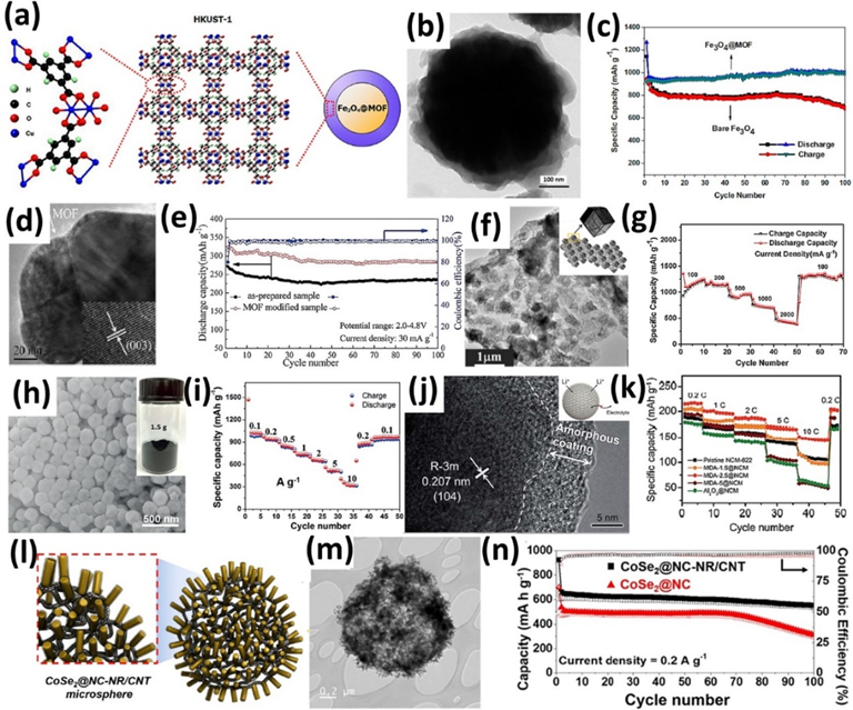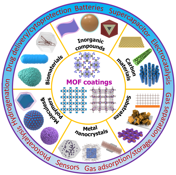 金属有机框架结构(MOFs)作为一类新型的多孔晶体材料,近年来引起了人们的广泛关注。通常地,MOFs包含金属离子/团簇和有机配体两个主要部分,并通过配位键组装而成。通过改变金属离子/团簇和有机配体的种类,研究人员已经成功地制造了成千上万的MOFs。由于它们独特的结构,MOFs展现出超高的孔隙率(约90%)、超高的表面积(高达6000 m2 g-1)、均匀可调的孔、充分暴露的活性位点、可调的形貌和丰富的组成,在诸多应用领域中展现出极大的潜力。然而,单纯MOFs的特定几何形态、有限功能和不尽如意的性能阻碍了其进一步的应用。近些年,为了解决上述问题,一种有效的方法是通过整合MOF涂层与功能化材料而形成具有协同优势的复合材料,进而展现出巨大的应用前景,包括电池、超级电容器、催化、气体存储与分离、传感器、药物输运和细胞保护等。然而,系统的合成策略及其结构与应用性能之间的关系还未被深入理解及总结。
