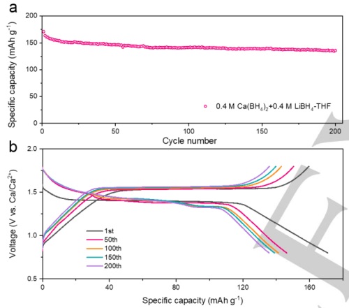 a) Ca(BH4)2-LiBH4-THF电解液在0.2 C(1 C=175 mAh g-1)恒电流循环下,在Ca || LTO全电池中LTO正极材料的放电比容量;