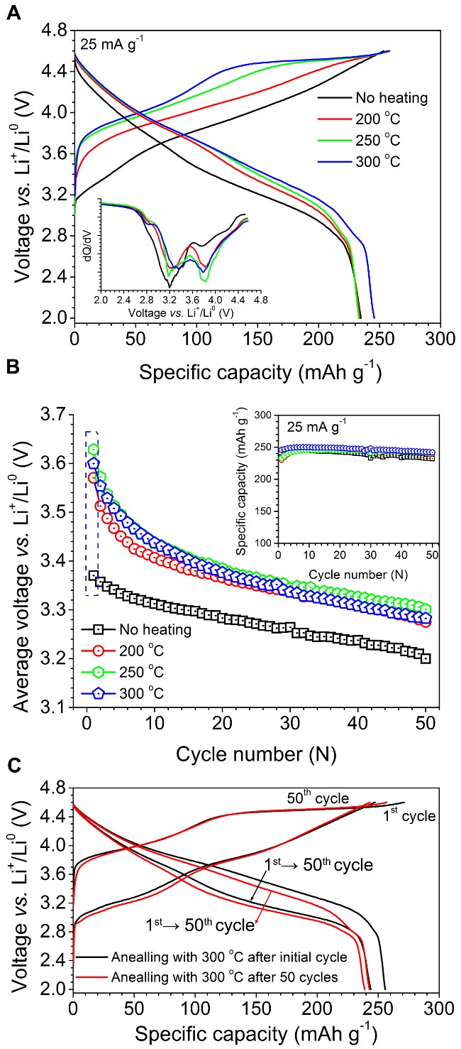 采用不同温度处理经过循环50次后的富锂锰基正极材料和锂金属作为负极重新组装成扣式电池。随着退火温度的升高,充电过程约4.5V vs. Li+/Li0的高压平台逐渐出现。电容电压微分曲线图中还原峰的位置明显向更高电压方向移动使得放电的平均放电电压从3.370V明显增加到3.628V。此外,不管电极是经历一次循环还是50次循环,热处理后的首次电化学循环几乎相同。总之,通过热处理可以使循环后的富锂锰基正极材料恢复平均电压,尽管在电化学循环过程中电压衰减是不可避免的。