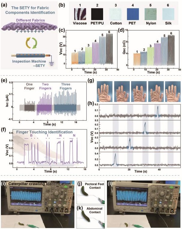 (d, f, h-i)手指轻轻压在织物上的相应电压信号和3D输出信号;