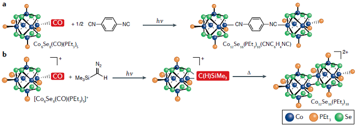 特定的块体化合物(如过渡金属硫化物/卤化物)[3]具有簇特征的基础结构单元,可以通过剥离的手段从晶格中得到超原子。这种剥离手段首先将块体与封端配体(氰化物等)进行加热,在加热过程中配体可以稳定剥离出的分子簇,随后可用有机分子将配体化合物取代出来。