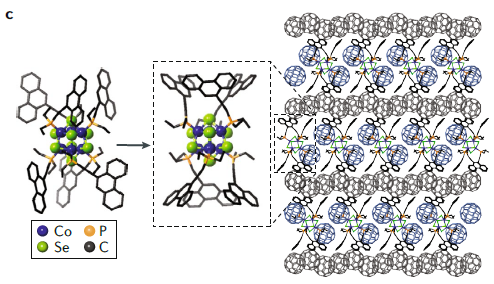 有机无机杂化材料的出现为超原子晶体的组装提供了新的思路。例如超原子的电结晶,可以利用超原子簇作为构建模块组装形成具有晶格的晶状固体,其中超原子上的氰化物配体能够通过氢键作用引导晶格的形成。因此利用有机电活性分子结合富电超原子簇可以组装形成新型的二元超原子晶体。在这类晶体中,电荷向电子受体单元(例如C60)转移,通过电荷转移驱动作用聚集组装产生二元离子组分。因此,电子受体单元如C60、C70以及富勒烯等也可以组装形成碳基超原子晶体。除此之外,电互补性较强的无机构建模块,如金属硫化物、金属氧化物或者金属卤化物均可以组装形成超原子晶体。