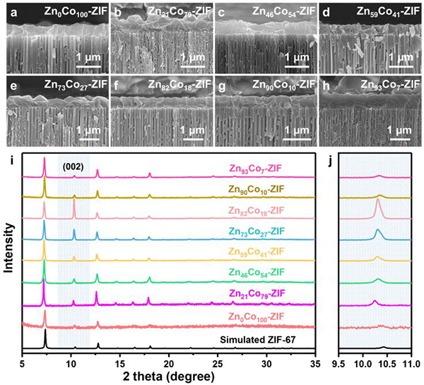 图二、Zn(100-x)Cox-ZIF膜的形貌结构表征(a-h)双金属Zn(100-x)Cox-ZIF膜的截面SEM图。其中,膜与基底接触良好,无明显分层现象,且膜厚度均小于700 nm;