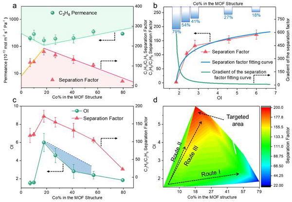 图三、柔性和晶界结构对双金属Zn(100-x)Cox-ZIF膜的气体分离性能影响(a)“火山图“曲线:柔性(Co%表示)对双金属膜C3H6/C3H8分离性能的影响;