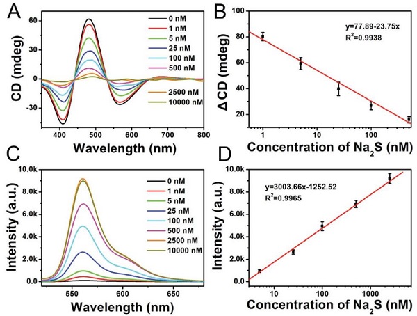 众所周知,硫化氢(H2S)是生命有机体中的重要气体传输剂,在调节细胞生长、抗炎等一系列生物过程中发挥重要作用。研究发现H2S的异常调节与糖尿病、肝硬化等疾病有关。因此,开发在生物系统中准确监测H2S的方法非常重要。目前,已经开发了电化学分析、表面增强拉曼散射等多种方法来检测和跟踪生物系统中的H2S。虽然已经取得了重大进展,但是仍有一些关键问题需要解决,例如灵敏度低、活细胞定量、标本破坏和光毒性。还有一个特殊挑战是,当比复杂生物系统中的H2S浓度更高时,将受到谷胱甘肽(GSH)等化学物质的干扰。因此,开发适用于复杂生物系统、能以高灵敏度和选择性检测H2S的策略异常重要。此外,圆二色性(CD)光谱是一种理想且功能强大的生物检测分析技术,因为其能以高灵敏度进行无损细胞分析。