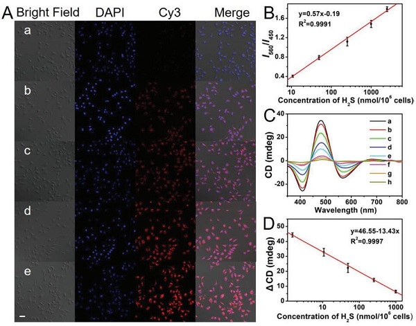 图三、CuxOS-Cy3@ZIF-8纳米探针基于CD和FL双模式检测H2S