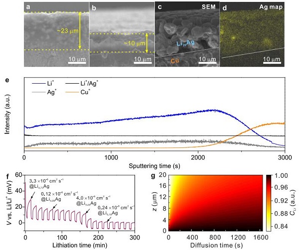 (c-d)在20次去锂化-锂化循环后,Li20Ag负极的横截面SEM图像和相应的Ag元素图;