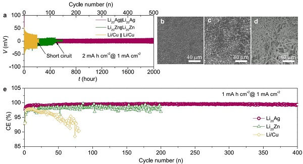 (b-d)Li20Ag(b)、Li20Zn(c)和Li/Cu(d)负极在1 mA cm-2电流密度下,以2 mA h cm-2面容量进行20次去锂化-锂化循环后的形态;