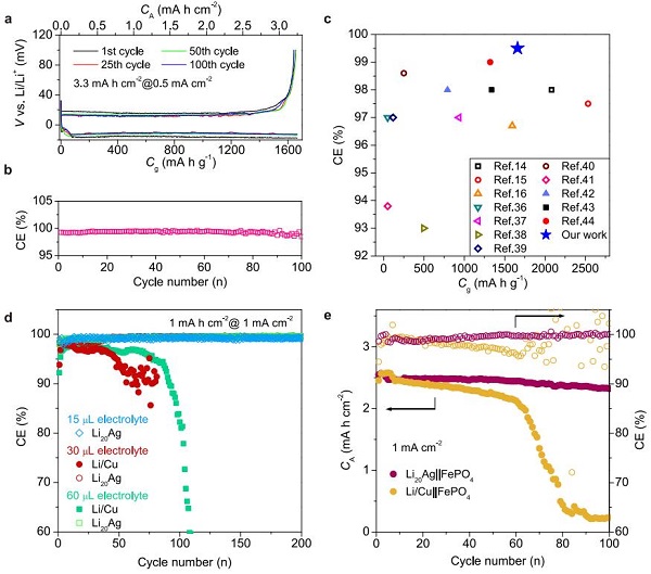 基于以上思路,中国科学技术大学的季恒星教授(通讯作者)团队和中国科学院化学研究所分子纳米结构与纳米技术重点实验室的万立骏院士团队联合报道了一种新型金属负极LixAg(x=4.7-20)合金。这种富Li合金被称为gamma相Li-Ag合金,具有Brass合金结构,Li20Ag和Li4.7Ag合金之间的晶体结构几乎保持不变,满足固溶合金化反应的条件,合金相变高度可逆。该合金的锂化-去锂化反应分别发生在-0.015和+0.015 V(相对于Li/Li+电势)。研究发现,合金化反应在锂化过程中引导新生成的Li原子沉积到金属箔中,而去合金反应时则从金属箔内部提取Li原子。这样一个过程完全避免了Li在电极表面不断发生的沉积/剥离,从而在抑制副反应同时获得了无枝晶金属负极,使得LMB全电池能够在低电解质消耗以及负极-正极容量比为1.1的条件下稳定的循环工作。最后,该合金负极的库仑效率能达到99.5±0.2%,可逆容量为1660 mA h g-1(3.3 mA h cm-2)。相关研究成果以 “Solid-solution based metal alloy phase for highly reversible lithium metal anode”为题发表在著名学术期刊J. Am. Chem. Soc.上。