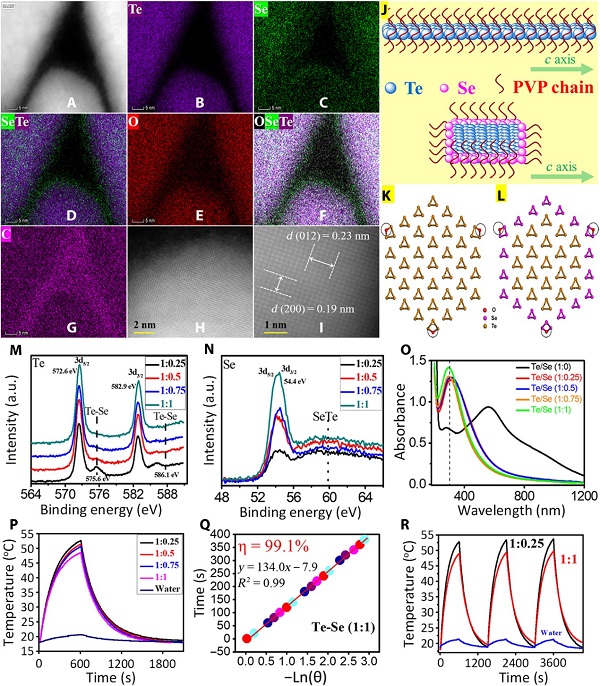 (J)提出了在PVP链和纳米线存在下Te和Se原子排列的示意图和椭圆形状,分别解释了Te和Se在一维和二维几何中的关系。