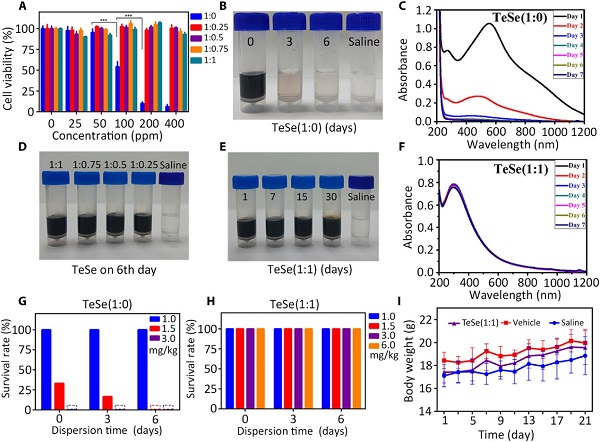 (G)注射不同剂量(1.0、1.5和3.0 mg/kg)不同分散时间(0、3和6天)的纯Te纳米材料后,小鼠的存活率。