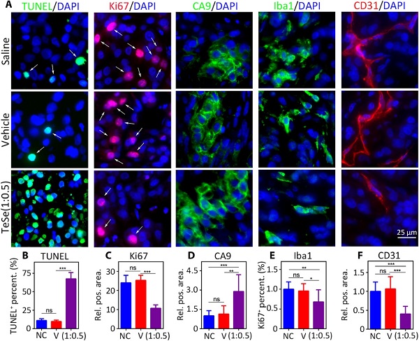 PTT后3天分离肿瘤,石蜡切片进行DNA断裂(TUNEL)、Ki67、CA9、Iba1和CD31的免疫荧光染色。