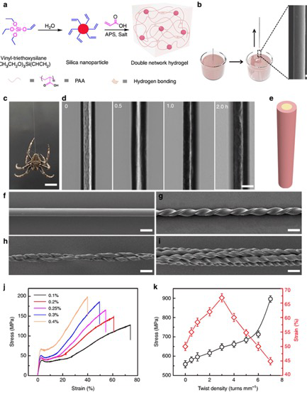 蜘蛛丝是典型的高性能天然纤维,具有高强度,高韧性,高延伸率和高阻尼能力。由于其理想的强度和质地特性而备受关注。目前对于蜘蛛丝结构的模仿主要使用蛋白质材料,而非蛋白质材料的人造蜘蛛丝很难制备。南开大学刘遵峰教授课题组使用聚丙烯酸与乙烯官能化的纳米二氧化硅交联形成的水凝胶成功制备了人造蜘蛛丝。该研究通过水蒸发控制的自组装模拟了蜘蛛丝的分层芯-鞘结构,并且通过离子掺杂和扭曲捻转进一步增强纤维性能。该人造蜘蛛丝的拉伸强度895 MPa,可拉伸性为44.3%,模量为28.7 GPa,韧性为370 MJm-3,阻尼能力为95%,具有与天然蜘蛛丝相似的机械性能。该研究提供了人造蜘蛛丝的非蛋白制造途径,且该人造蜘蛛丝在动能缓冲和减震领域有巨大的应用潜力。该研究以“Artificial spider silk from ion-doped and twisted core-sheath hydrogel fibres”为题发表在Nature Communication 上[2]。