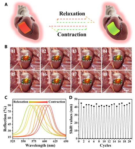 受到贻贝附着和眼球润滑的机理的启发,东南大学赵远锦教授及其团队开发出一种具有各向异性表面粘附特征和结构变色功能的水凝胶材料。该水凝胶膜由三维反蛋白石支架将聚多巴胺(PDA)层和聚乙二醇二丙烯酸酯(PEGDA)层结合在一起制得。PDA侧具有具有优异的粘附特性可用于修复受伤的组织,而PEGDA侧具有抗粘附特性以防止不利的粘附并减少与周围组织的摩擦。水凝胶贴片中PDA层中的邻苯二酚基团使得其还具有自愈合性能。除此之外,反蛋白石结构的存在使得水凝胶具有响应性的颜色变化。该水凝胶贴片在受到拉伸时,其反射颜色会发生从橙红色到绿色的动态色移。实时的颜色感应反馈能够在实际应用中监视心跳活动和水凝胶的黏着修复过程。因此该水凝胶材料在组织工程和其他生物医学领域有巨大的应用前景。相关研究题为“Bioinspired structural color patch with anisotropic surface adhesion”发表在Science Advance 上[3]。