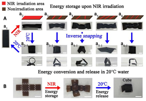 模仿自然界中复杂而快速的驱动现象对于响应性形状转变水凝胶的开发具有重要意义。植物的极快运动通常与能量的积累和迅速释放有关。青岛大学隋坤艳教授和复旦大学聂志鸿教授(共同通讯)受此启发设计出可以超快速反折变形的响应水凝胶片材。该研究使用紫外诱导氧化石墨烯产生自由基以引发DMAEMA单体和N,N’-亚甲基双丙烯酰胺的聚合,从而产生水凝胶片材。 GO对UV的强烈吸收导致沿厚度方向的光强梯度形成,从而形成具有双梯度(PDMAEMA链密度和交联密度)的rGO / PDMAEMA复合水凝胶片。该水凝胶片可以通过转换预存储的热能或化学能积累弹性能并响应外部刺激快速反折(<1 s)释放能量。该研究能够通过控制水凝胶中预先存储能量的大小和位置,对水凝胶片的响应行为进行编程以实现不同的结构和驱动行为。相关研究以“Dual-gradient enabled ultrafast biomimetic snapping of hydrogel materials”为题发表在Science Advance上[4]。