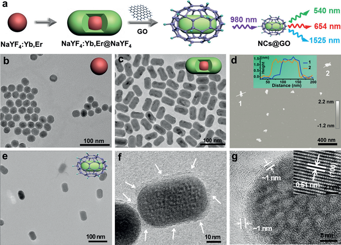 合成对生物成像具有分子识别能力的亲水性镧系元素掺杂纳米晶体(Ln3+ -NCs)仍然是急需解决的问题之一。中国科学院福建物质结构研究所陈学元课题组提出了一种有效的策略解决该问题,即通过将Ln3+ -NCs封装在氧化石墨烯(GO)中。通过优化GO尺寸和NaYF4:Yb,Er @ NaYF4的核-壳结构来制备单分散NCs @ GO,从而结合了纳米晶强烈的可见/近红外II(NIR-II)发光以及GO独特的表面性质和生物医学功能。该纳米结构不仅具有广泛的溶剂分散性、有效的细胞吸收能力和出色的生物相容性,而且还可以使用各种试剂(例如DNA、蛋白质或纳米颗粒)进行进一步修饰,而无需繁琐的程序。在该实验中证明NCs @ GO可以实现同时的细胞内跟踪和microRNA-21可视化,以及在1525 nm处实现体内靶向肿瘤的NIR-II成像。该方法为合成具有可定制的表面属性和生物医学功能的纳米探针提供一种新的见解,这成像和治疗应用具有重要意义。[1]相关成果以“Graphene-Oxide-Modified Lanthanide Nanoprobes for Tumor-Targeted Visible/NIR-II Luminescence Imaging”为题,发表在Angew. Chem. Int. Ed.。