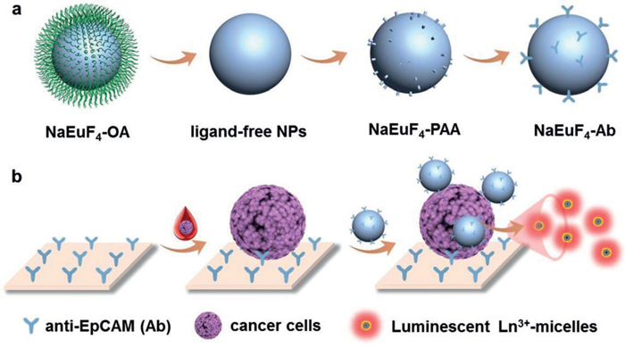 图三:NaEuF4纳米粒子功能化和CTC测定过程的示意图