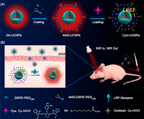 对于神经系统疾病的解释和治疗迫切需要一种可靠的实时跟踪神经炎症进展的工具。武汉大学/湖北大学刘志洪课题组设计了一种具有NIR发射的血脑屏障渗透性和HOCl激活的上转换纳米探针用于体内神经炎症的可视化研究。该上转换纳米探针由三部分组成:上转换纳米颗粒(UCNPs)作为信号单元,Cy-HOCl染料充当UCNPs的能量受体和HOCl的识别单元,以及使探针具有生物相容性和血脑屏障渗透性的两亲聚合物。静脉内注射给小鼠后,该探针通过低密度脂蛋白受体相关蛋白介导的胞吞作用穿过血脑屏障,然后在神经炎症过程中被过量产生的HOCl刺激恢复荧光。该探针能够区分低密度脂蛋白受体相关蛋白诱导的神经中的炎症和大脑的正常状态,并监测脑卒中小鼠中神经炎症的进展,从而为神经炎症的无创和可视化评估提供了实用工具。[8]相关成果以“Monitoring Neuroinflammation with an HOCl-Activatable and Blood-Brain Barrier Permeable Upconversion Nanoprobe”为题,发表在Anal. Chem.。