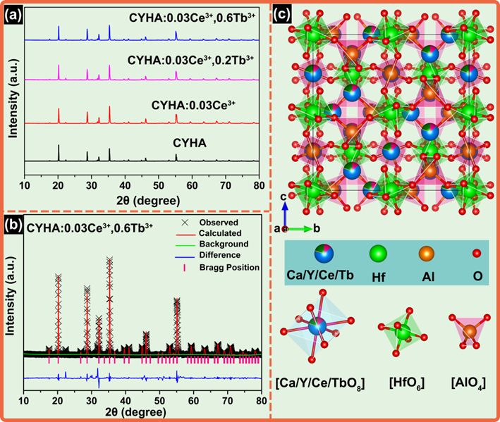 图一、CYHA:Ce3+,Tb3+绿色荧光粉的物相与晶体结构表征