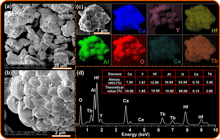 (a, b) CYHA:0.03Ce3+,0.6Tb3+绿色荧光粉的SEM图。