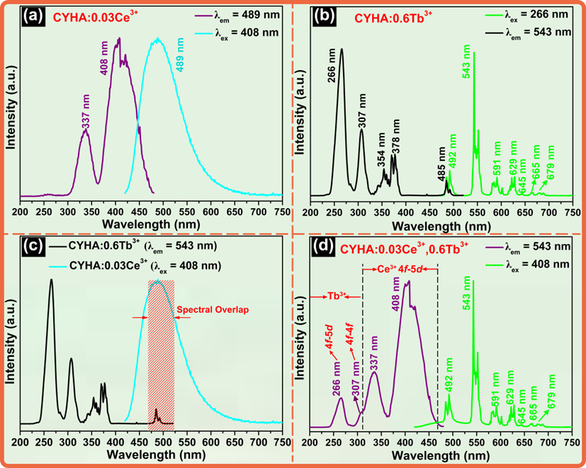 (c) CYHA:0.6Tb3+荧光粉的激发光谱与CYHA:0.03Ce3+荧光粉的发射光谱对比图。