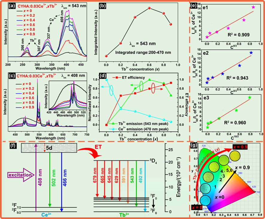 (c) CYHA:0.03Ce3+,xTb3+荧光粉的发射光谱。