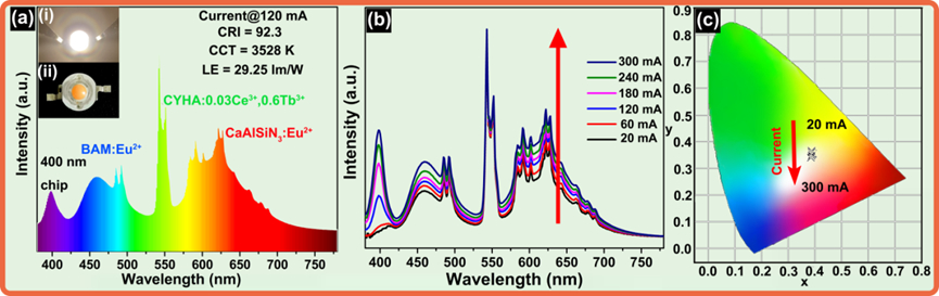 (b) 用CYHA:0.03Ce3+,0.6Tb3+绿色荧光粉制备的LED器件在60 mA电流下的发射光谱。