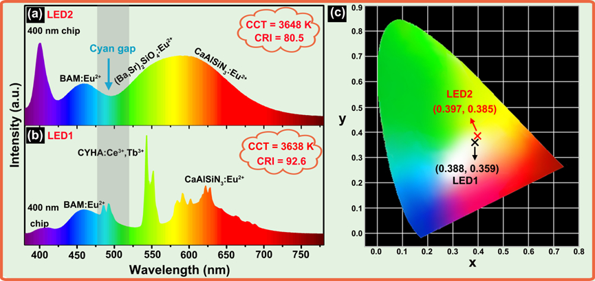 图六、CYHA:0.03Ce3+,0.6Tb3+与(Ba,Sr)2SiO4:Eu2+的发光对比