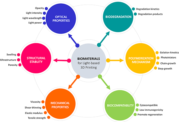 图一、光基3D打印技术在组织工程和再生医学应用中的生物材料选择标准概述