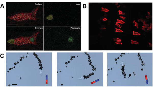 图十七、微形鱼图像的3D打印(A)定位于头部、尾部和身体的3D微鱼的不同纳米粒子的能量色散X射线;