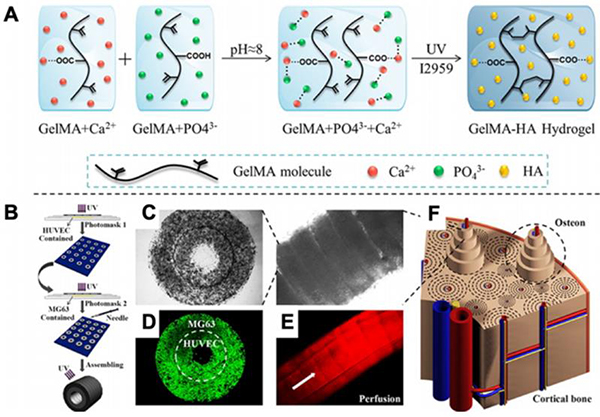 图十八、羟磷灰石(HA)的3D打印(A)GelMA网络中羟磷灰石(HA)形成机理的示意图;