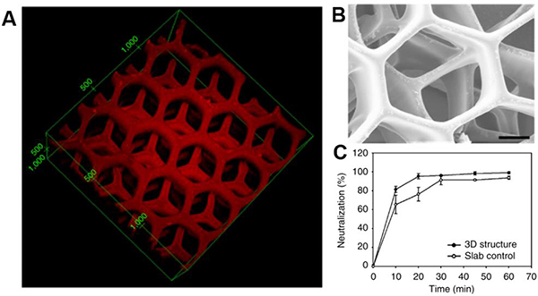 图十九、3D打印肝脏解毒装置(A) 聚二乙炔纳米粒子包裹在PEGDA中的3D肝脏驱动解毒装置的荧光图像;