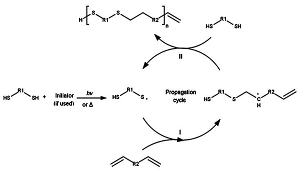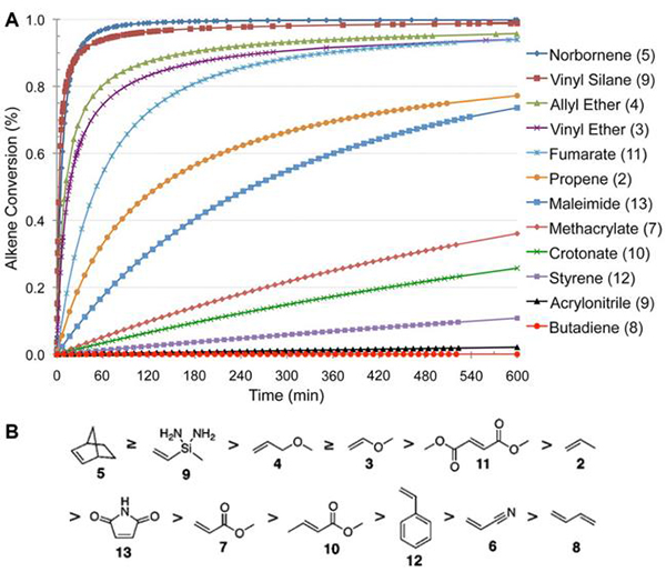 图三、烯烃基团选择对硫醇−烯反应动力学的影响(A)硫醇−烯反应动力学的理论计算取决于所选择的烯烃基团的反应性;