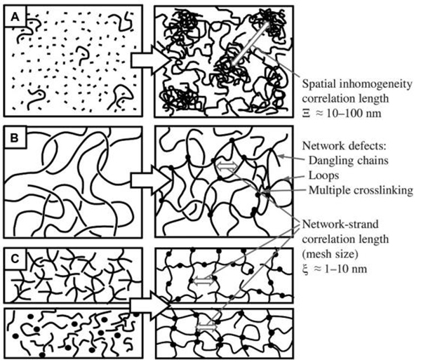 图四、取决于不同交联机理和由此产生的不均匀程度的水凝胶网络(A)单体和交联剂的自由基链生长聚合导致网络结构中的空间不均匀性;