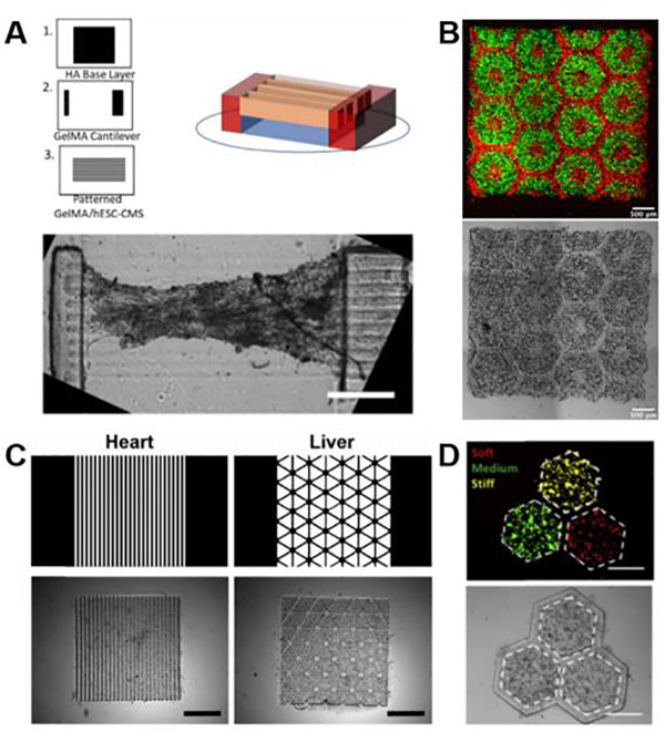 (A)使用GelMA打印的悬臂式心脏组织的示意图和图像;