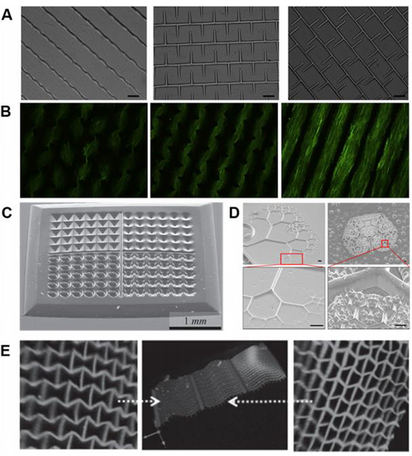 图七、用于细胞生物学的各种3D打印PEG基水凝胶结构(A)3D打印的PEGDA图像;