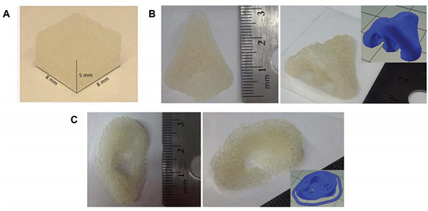 将Nor-PGS3D打印为(A)立方体,(B)鼻子形和(C)耳朵形结构