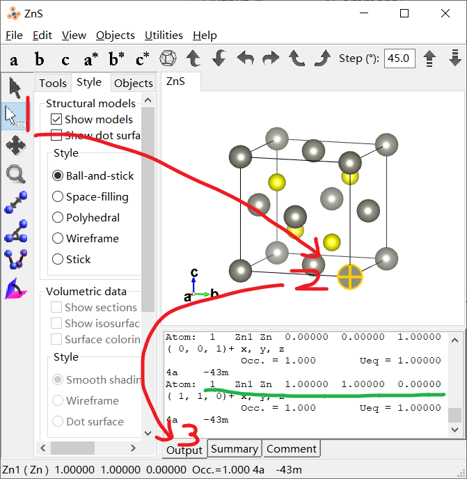 如图12,使用垂直工具栏上的“选择”工具,选择你想查看的原子,然后就能在Output里面获得原子坐标。(提示:在原子的右上角单击更容易选择上该原子)
